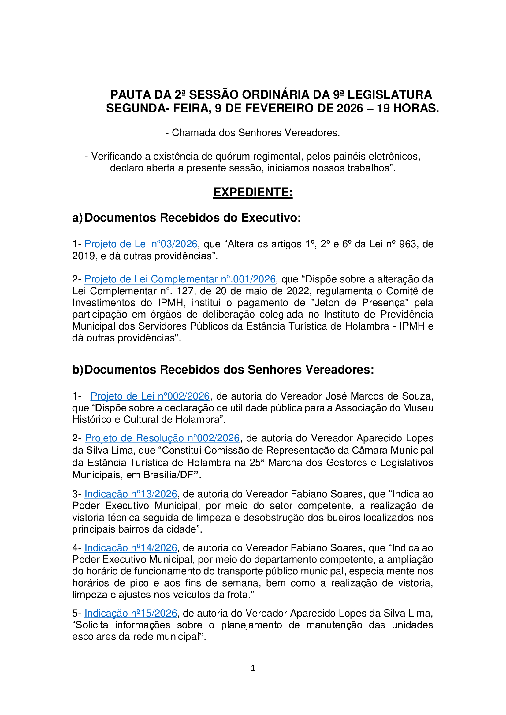 Entre os destaques, está o Projeto de Lei nº 03/2026, que altera dispositivos da Lei nº 963/2019, e o Projeto de Lei Complementar nº 001/2026, que trata de mudanças no Instituto de Previdência Municipal (IPMH), incluindo a criação do pagamento de Jeton de Presença.
