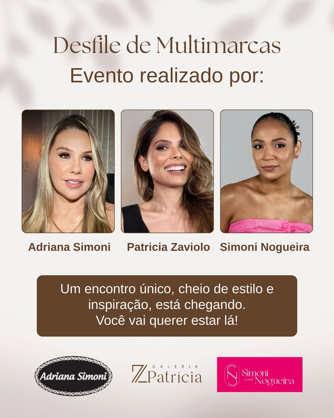 O evento contará com a participação de Adriana Simoni, Patrícia Zaviolo e Simoni Nogueira, três nomes que são referência em estilo e curadoria de moda. Juntas, elas trazem ao público um olhar moderno, sofisticado e inspirador sobre as principais tendências do momento.