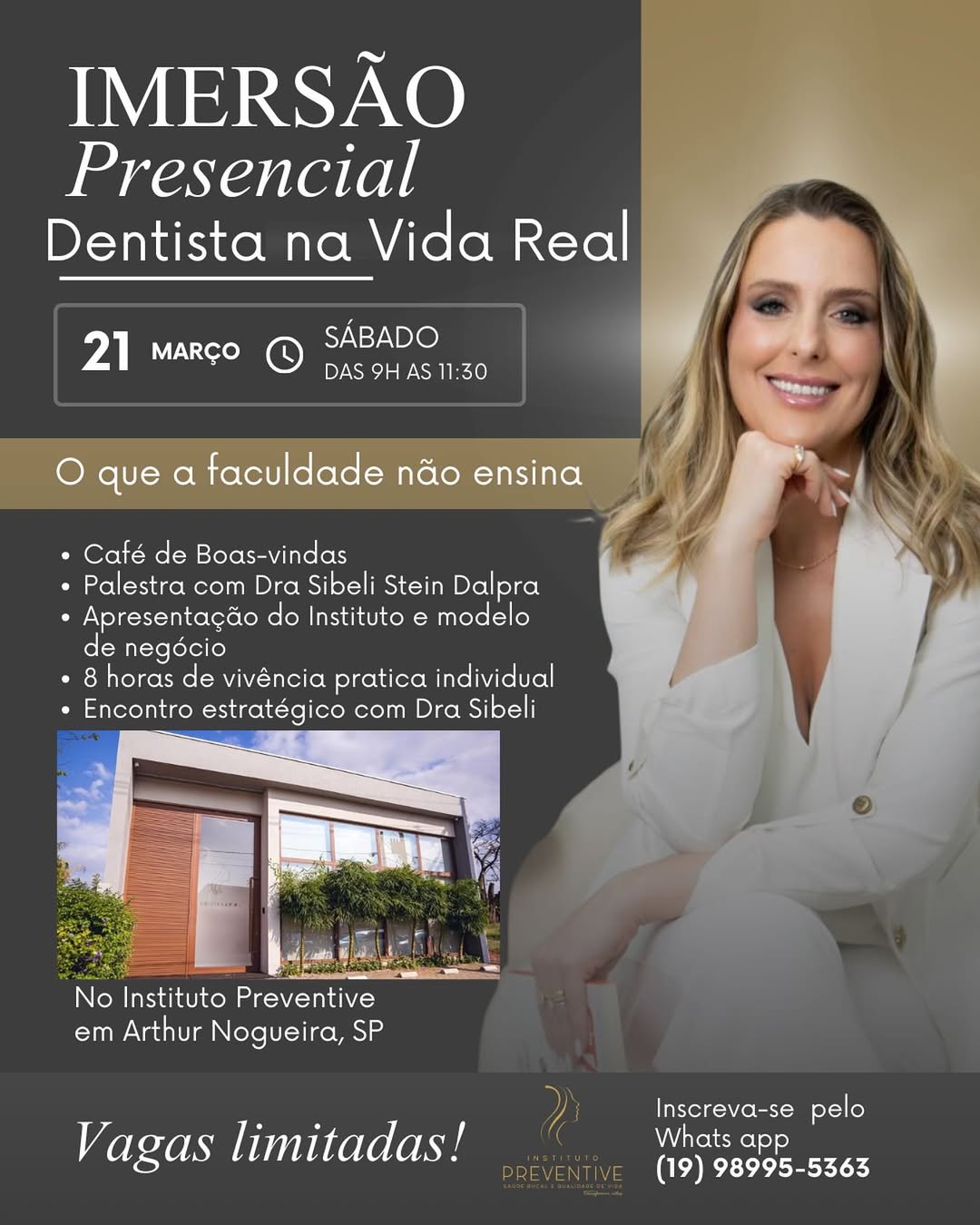 Pensando justamente em aproximar o conhecimento acadêmico da realidade profissional, estudantes de Odontologia e profissionais recém-formados terão a oportunidade de participar de uma experiência exclusiva de aprendizado prático em Artur Nogueira. No dia 21 de março, a Dra. Sibeli Stein Dalprá realizará a imersão presencial “Dentista na Vida Real”, no Instituto Preventive, com uma proposta voltada à formação estratégica e ao contato direto com a realidade da profissão.