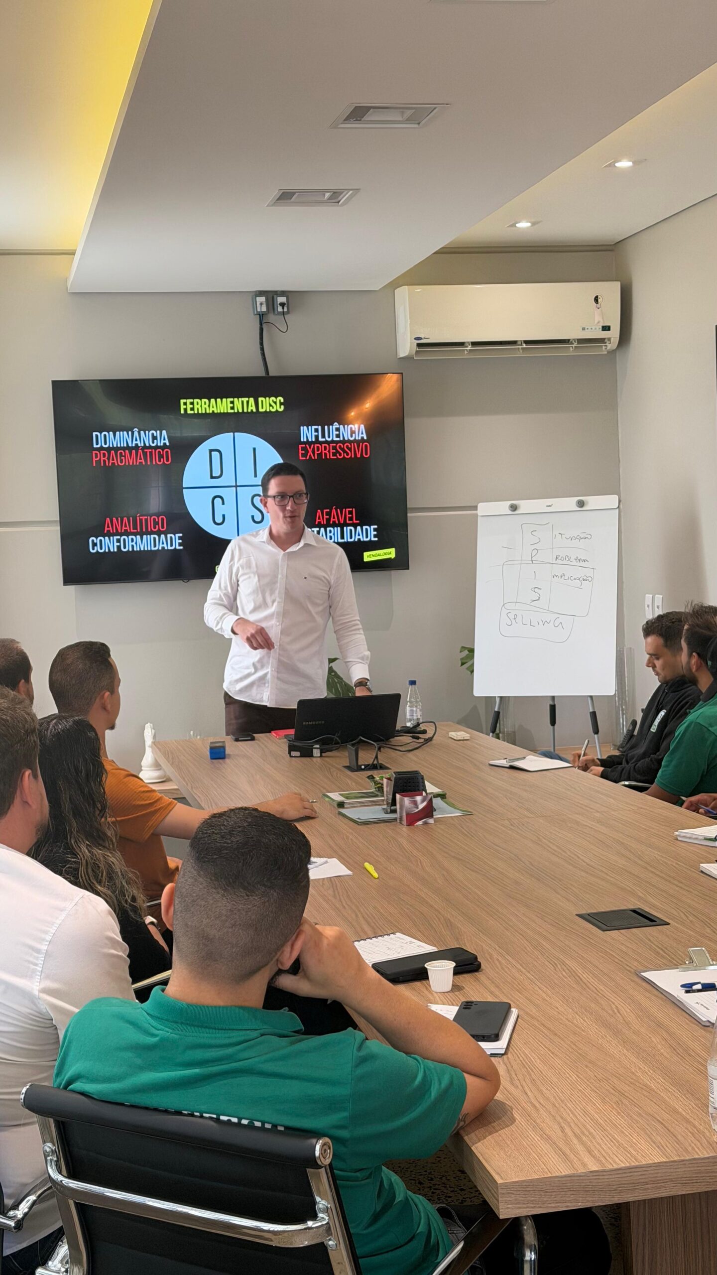 Um dos pontos centrais do treinamento foi a apresentação dos quatro perfis comportamentais e como identificá-los na prática. De forma descontraída e interativa, Alex mostrou como cada tipo de cliente tem necessidades e formas de comunicação diferentes, e como adaptar a abordagem pode transformar o resultado de uma venda.