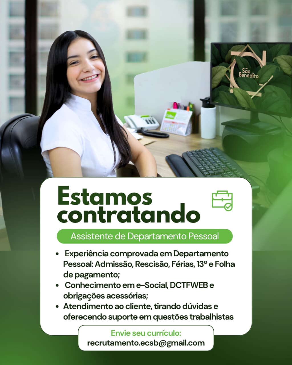Escritório São Benedito abre vaga para Assistente de Departamento Pessoal
