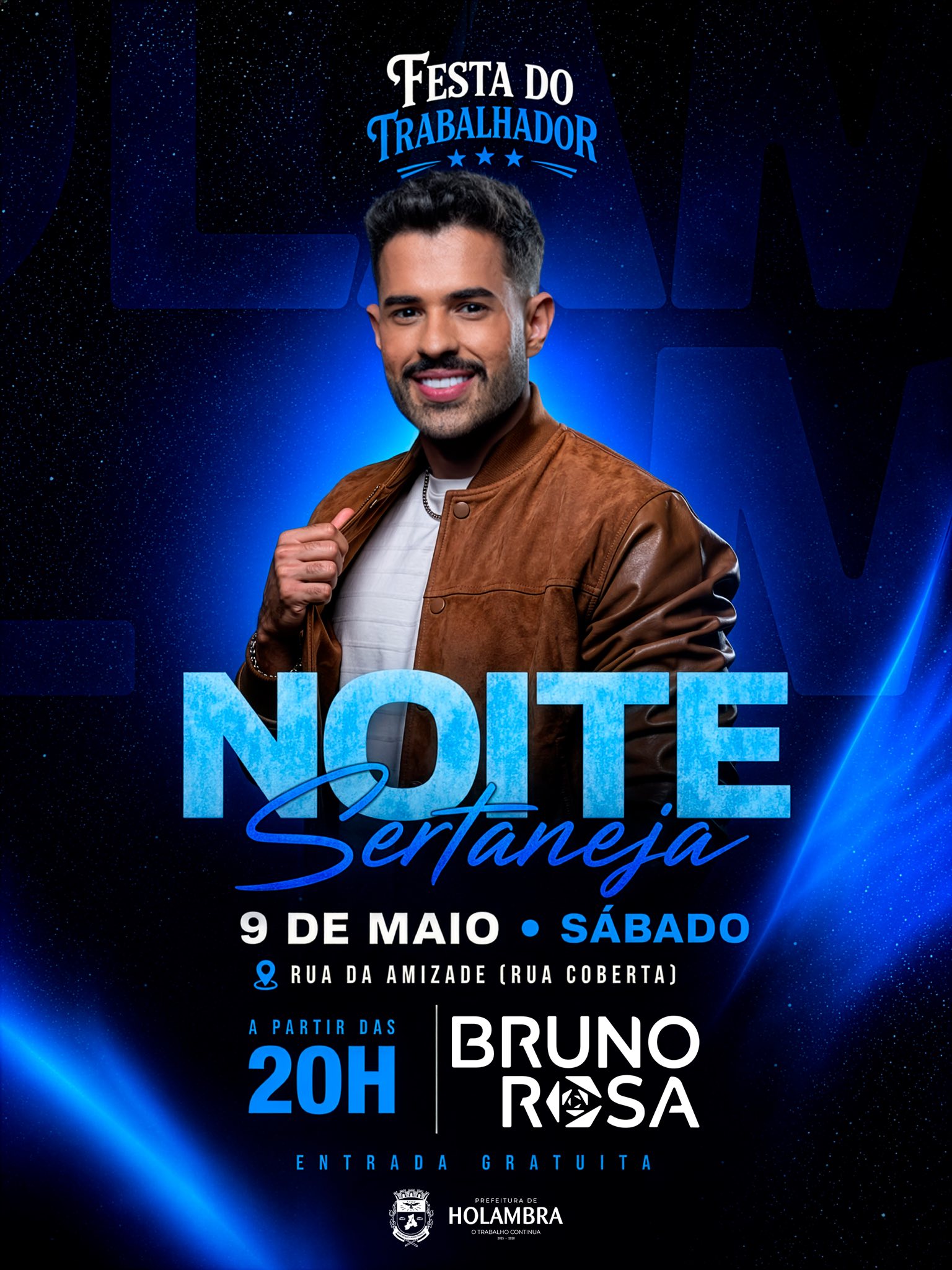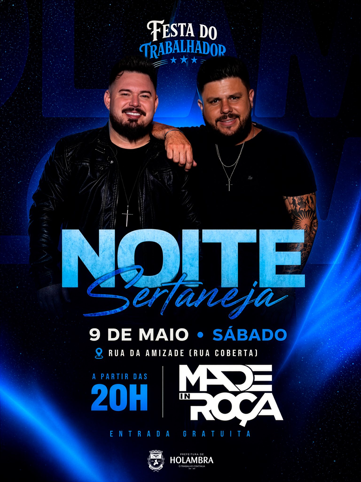 No sábado, 9 de maio, a partir das 20h, a programação segue com a Noite Sertaneja. As atrações serão a dupla Made In Roça e o cantor Bruno Rosa, intérprete de canções como Coice de Mula, Fiu Fiu e Grama do Vizinho. A entrada para os dois dias de evento será gratuita.