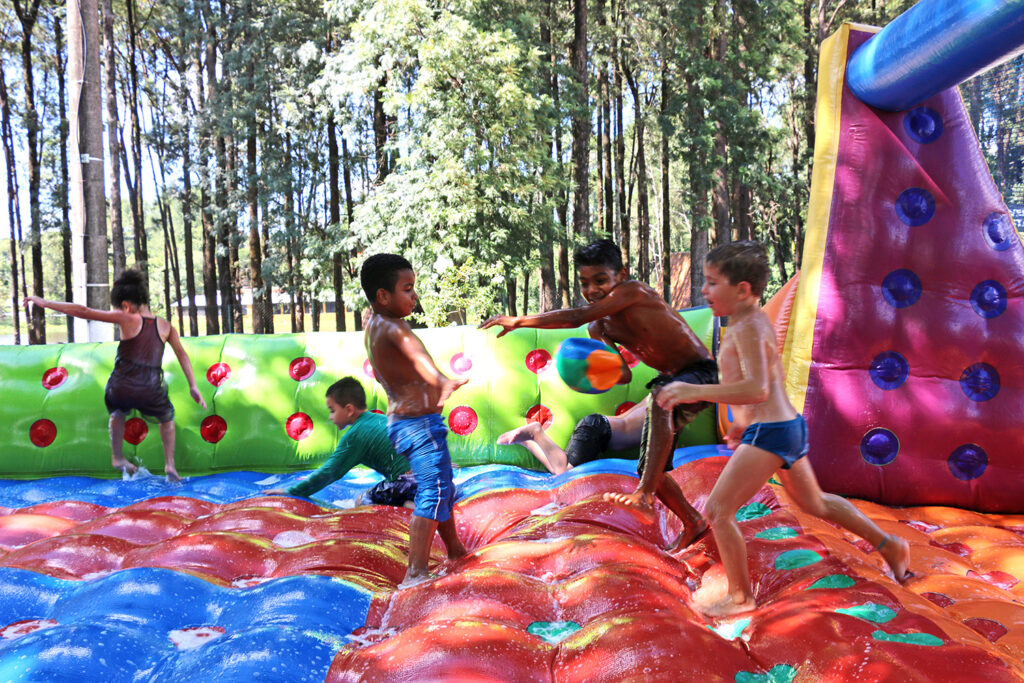 Brincando no Bairro com brinquedos infláveis, pintura facial, atividades esportivas, gincanas e distribuição de pipoca e algodão-doce