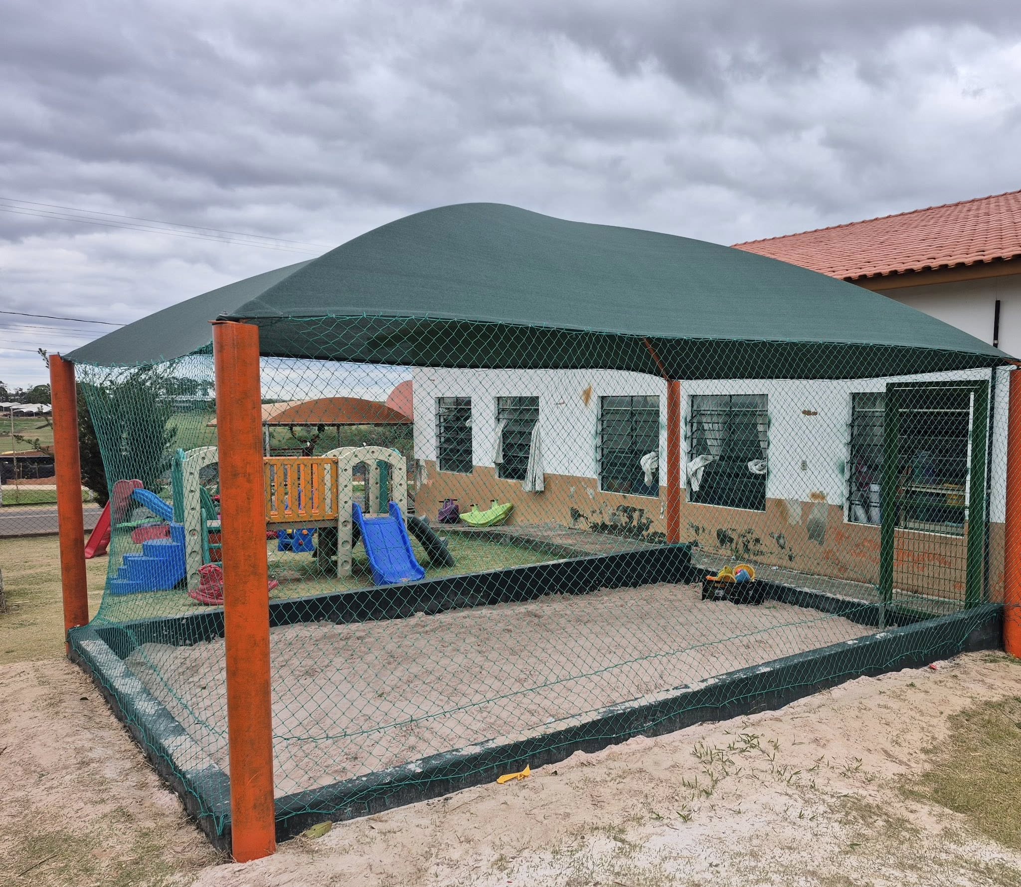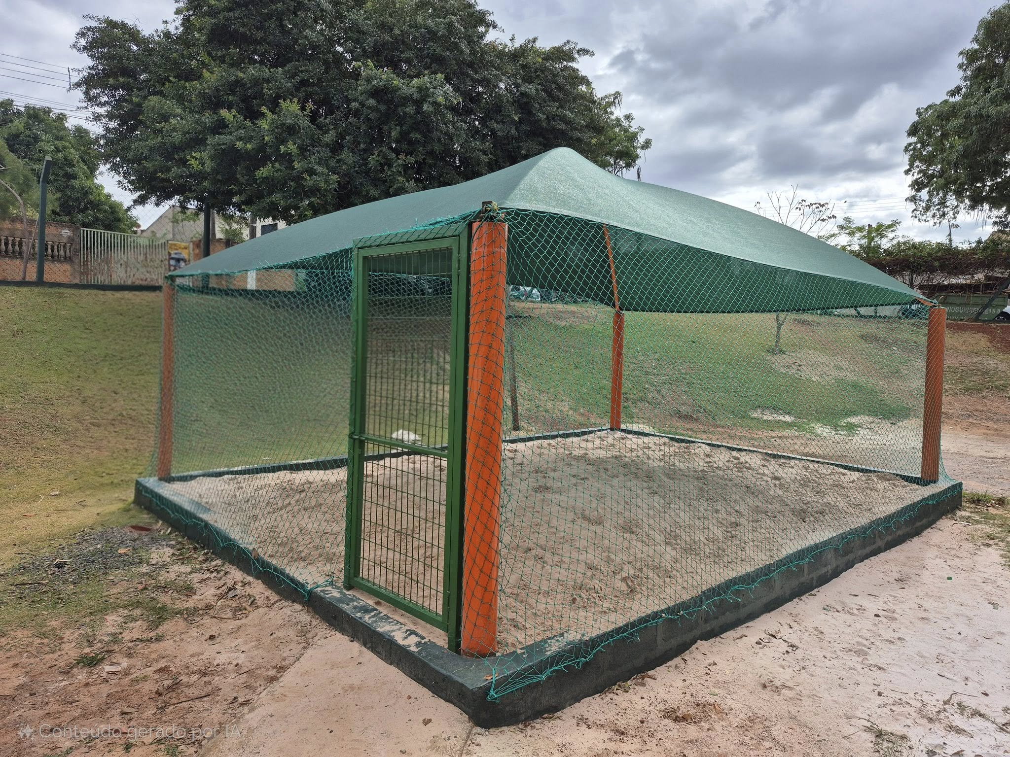 O trabalho incluiu a troca da tela de proteção para impedir a entrada de animais, pintura da alvenaria, instalação de cobertura para proteção contra o sol, substituição completa da areia e instalação de portões de acesso.