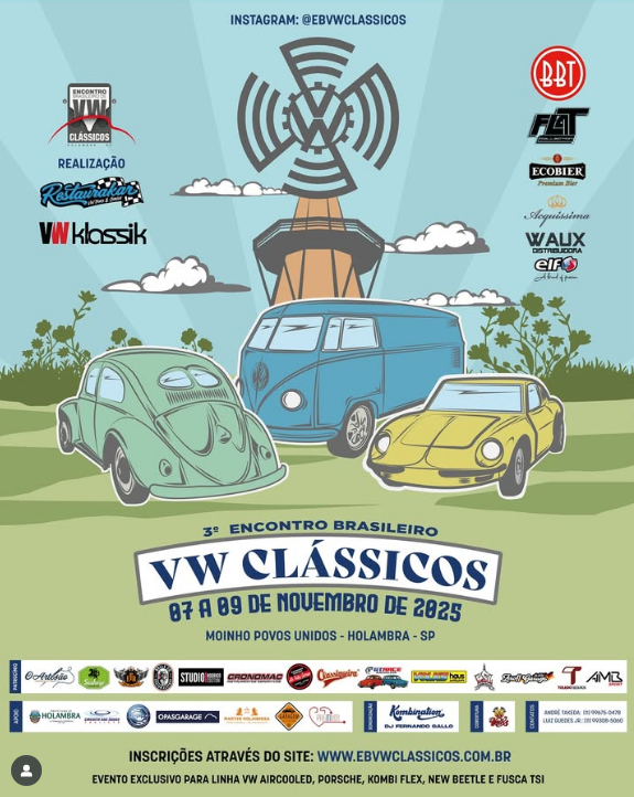 Holambra receberá entre os dias 7 e 9 de novembro de 2025 o 3º E.B.VW Clássicos – Encontro Brasileiro de VW Clássicos, evento que reunirá veículos da marca Volkswagen fabricados entre as décadas de 1940 e 1990. A programação ocorrerá no Moinho dos Povos Unidos.