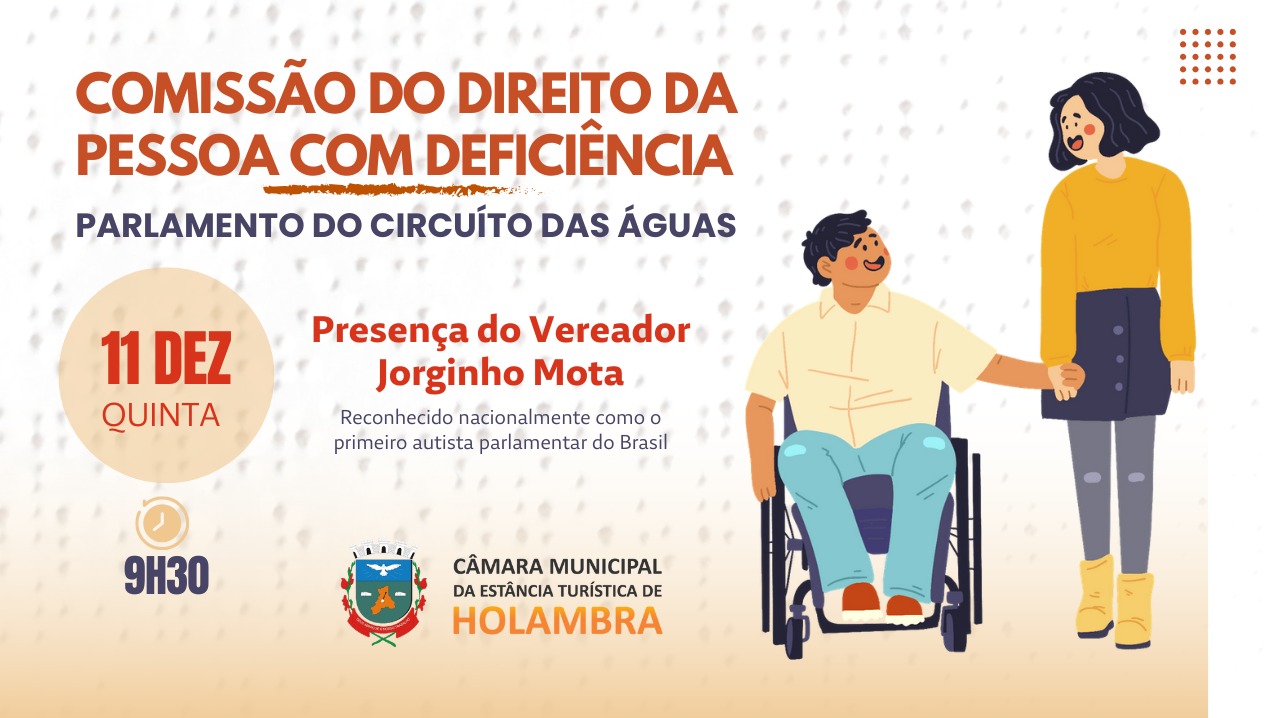 A Câmara Municipal de Holambra será palco da última reunião de 2025 da Comissão do Direito da Pessoa com Deficiência do Parlamento Circuito das Águas Paulistas, que ocorre nesta quinta-feira (11). O encontro terá início às 9h30 no plenário da Casa Legislativa, localizado na Rua Dr. Jorge Latour, 152, Centro, e será aberto ao público.