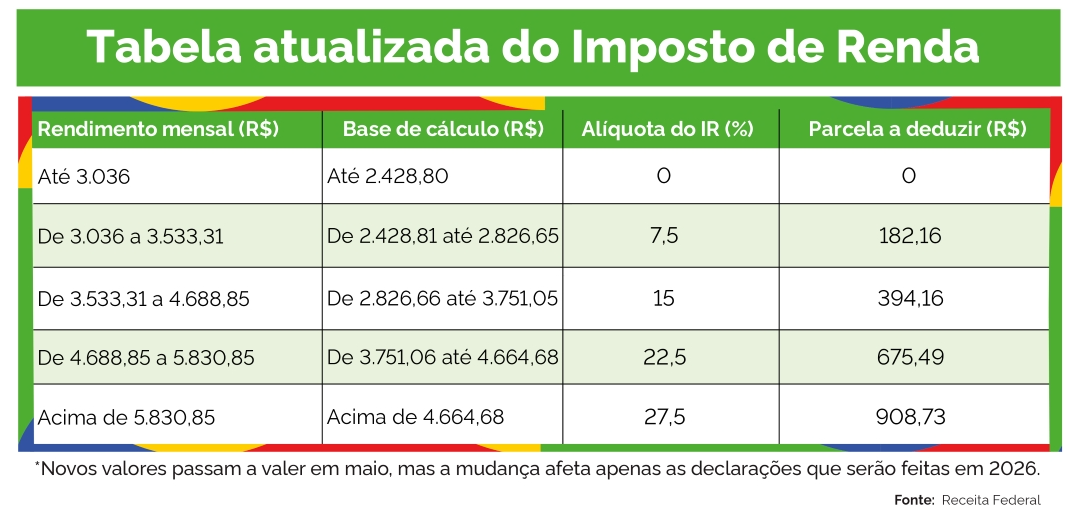 A nova tabela começa a valer a partir de maio de 2025, mas somente para as declarações de Imposto de Renda apresentadas em 2026. Ou seja, a declaração de 2025 (referente ao ano-base 2024) ainda seguirá as regras atuais.