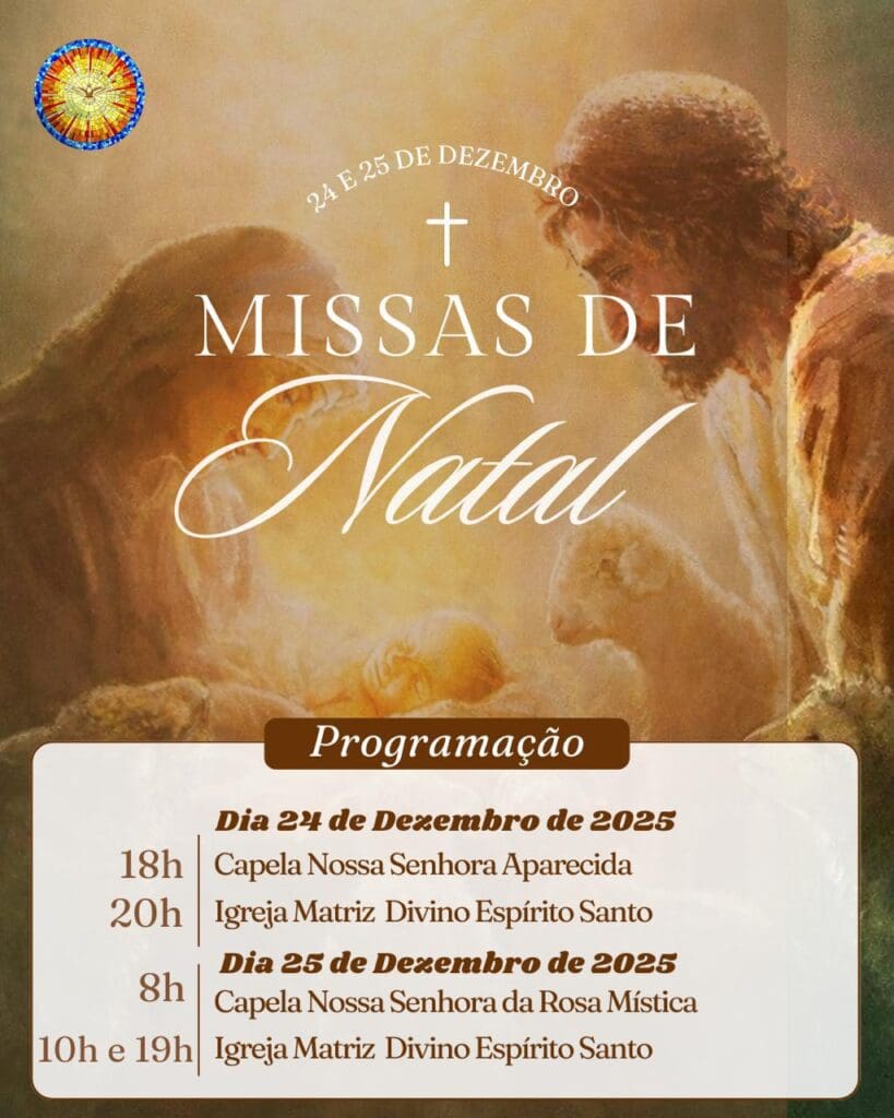 No dia 25 de dezembro, Natal do Senhor, a programação segue com a Santa Missa às 8h, na Capela Nossa Senhora da Rosa Mística. Na Matriz Divino Espírito Santo, os fiéis poderão participar das celebrações às 10h e também às 19h, encerrando o dia festivo do nascimento de Jesus.