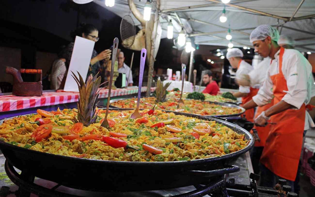 O público também encontra opções gastronômicas, como lanches preparados na brasa, massas artesanais e pratos da culinária regional.