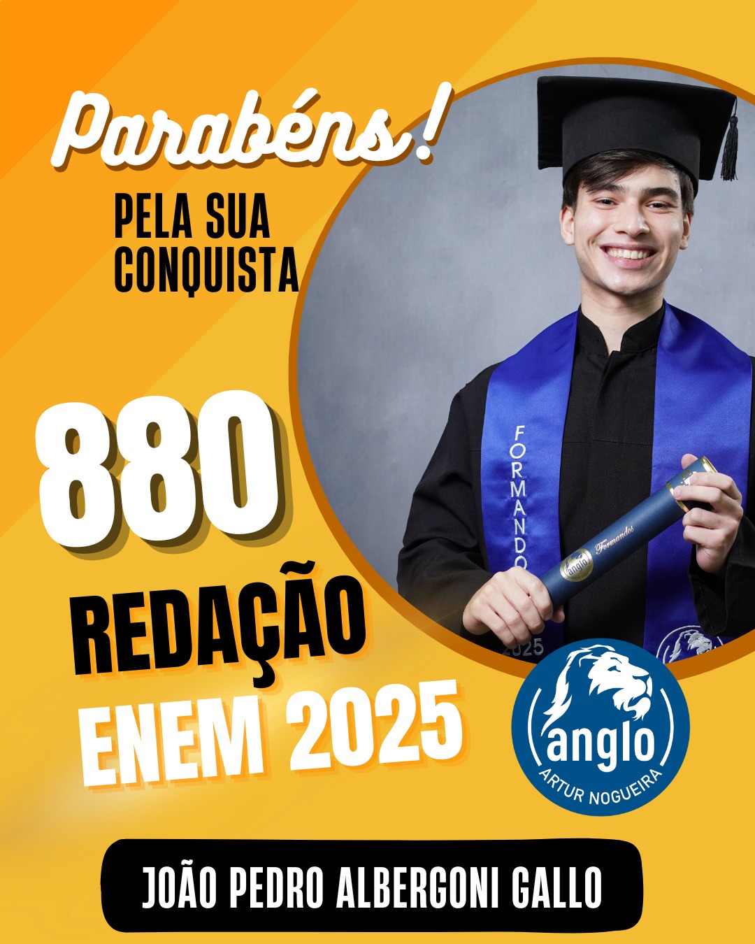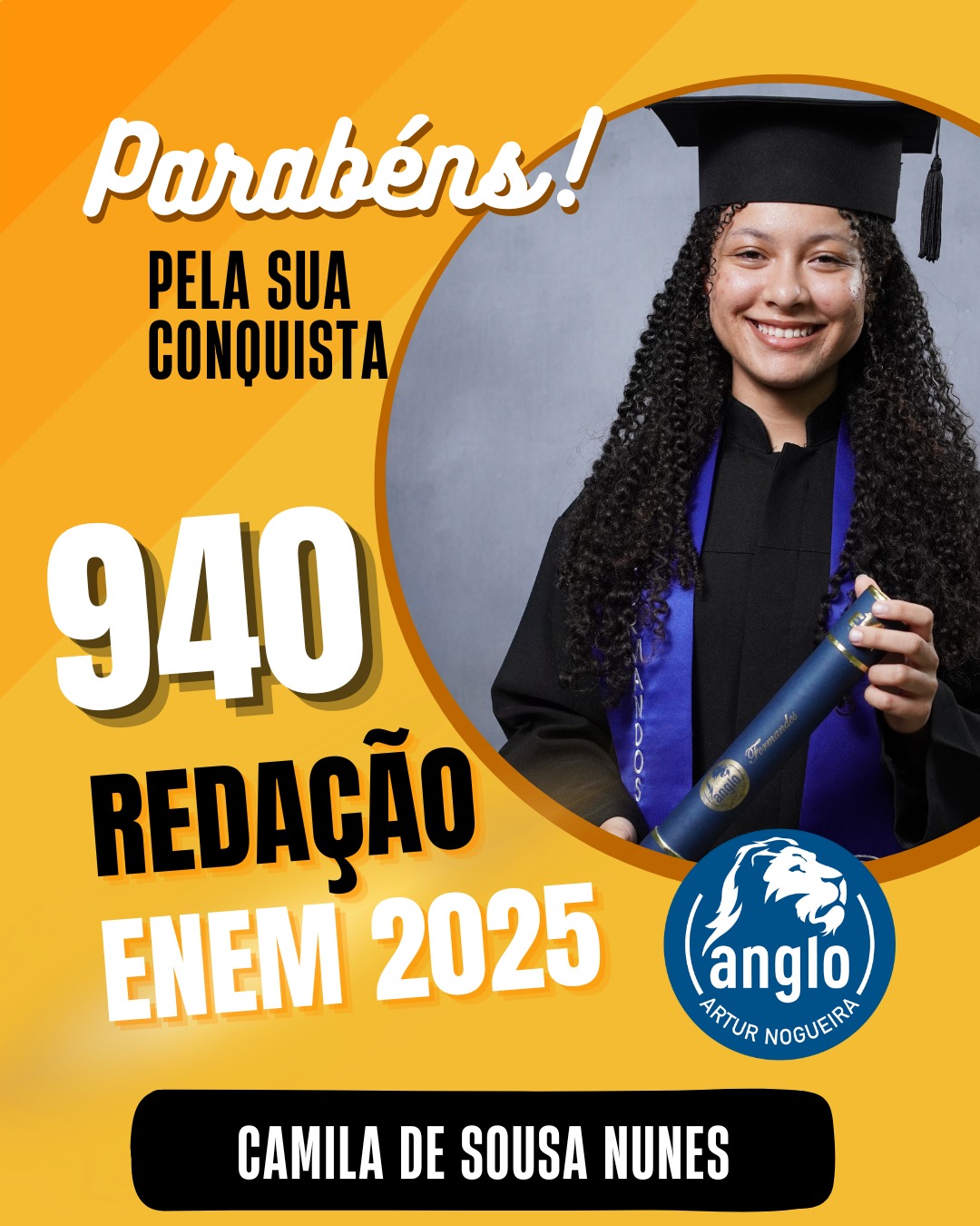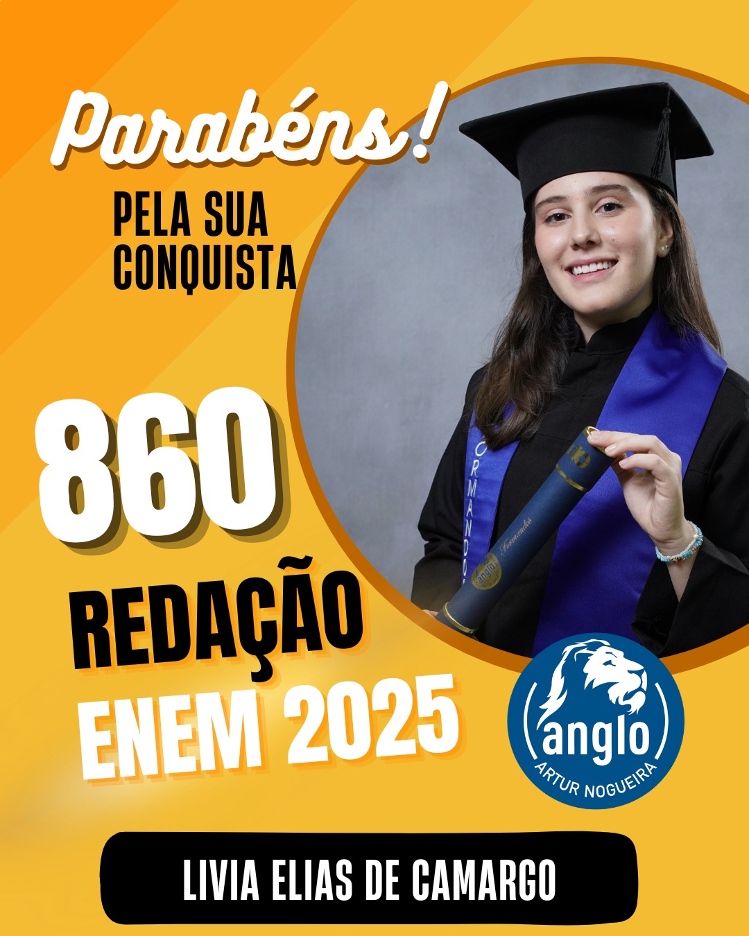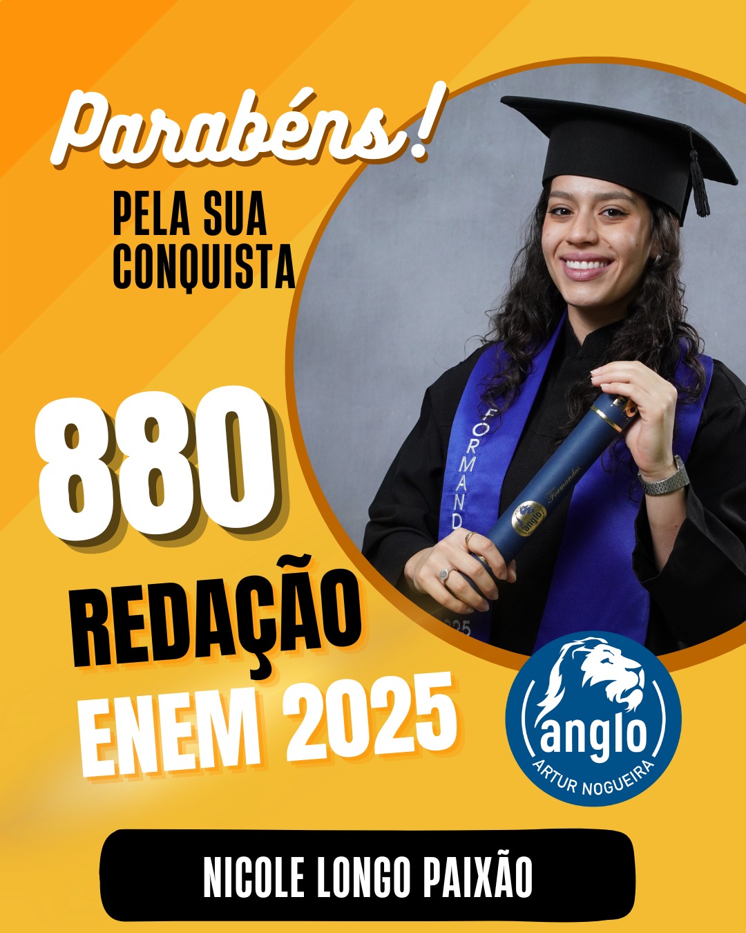O Colégio Anglo Artur Nogueira parabeniza todos os alunos que conquistaram excelentes notas no ENEM, com destaque especial para aqueles que se sobressaíram na redação. As artes comemorativas publicadas celebram não apenas os resultados, mas todo o percurso de estudo, persistência e amadurecimento vivido durante a trajetória escolar.