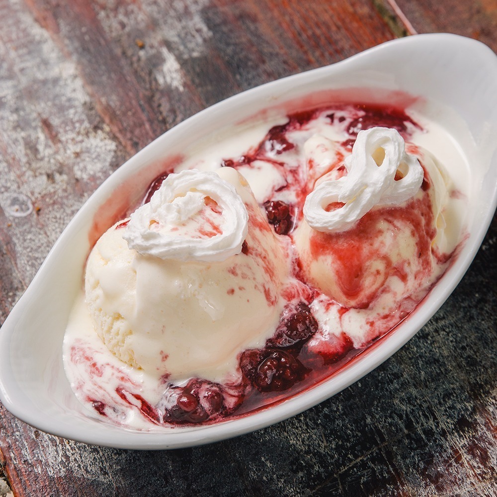 Para os que preferem um toque frutado, essa sobremesa une sorvete de creme com calda de amora. Refrescante, suave e elegante.