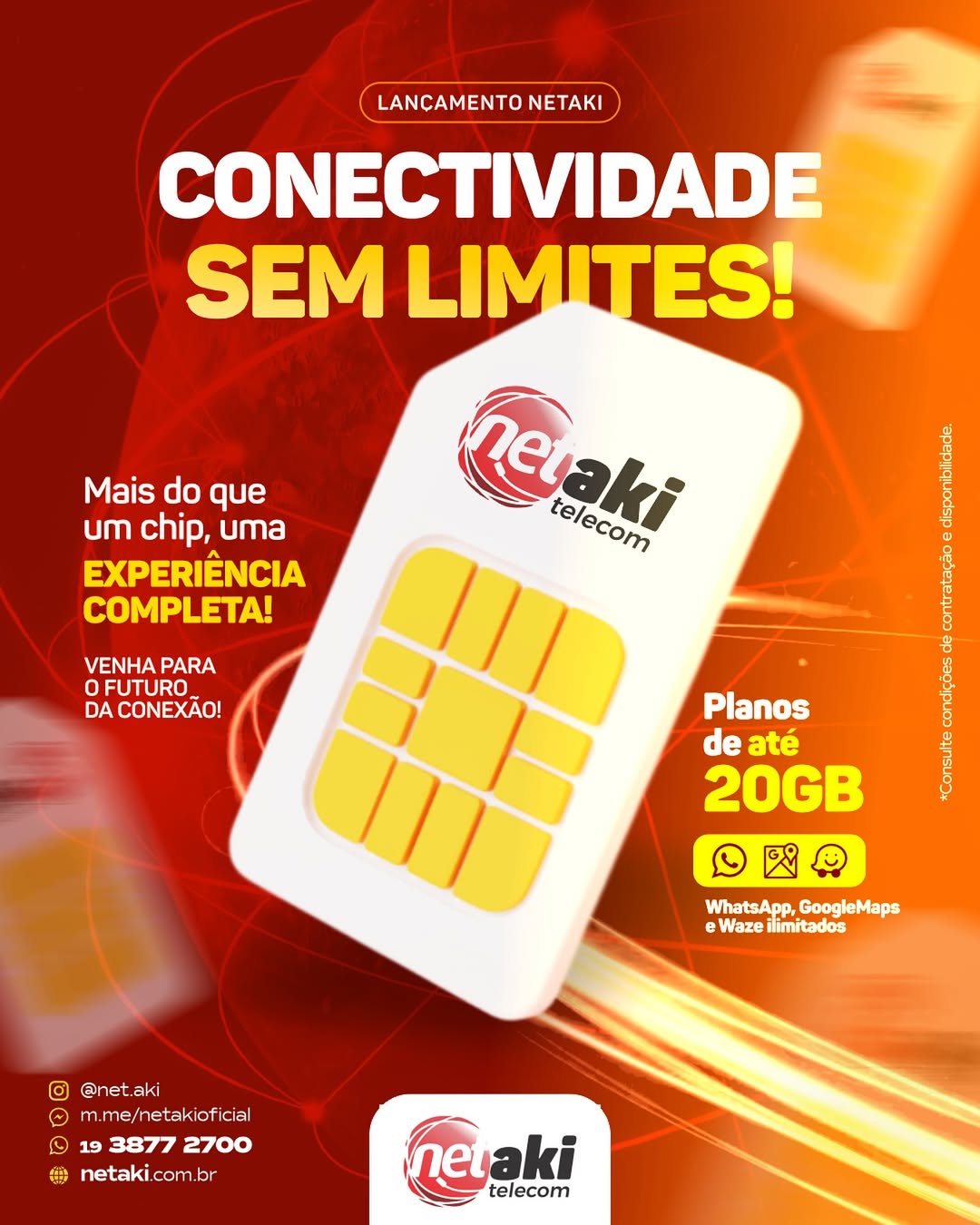 Com cobertura nacional e pacotes de dados que chegam a 20 GB, o chip móvel da Net Aki garante navegação estável em todo o país. Os planos incluem acesso ilimitado a aplicativos essenciais, como WhatsApp, Google Maps e Waze.