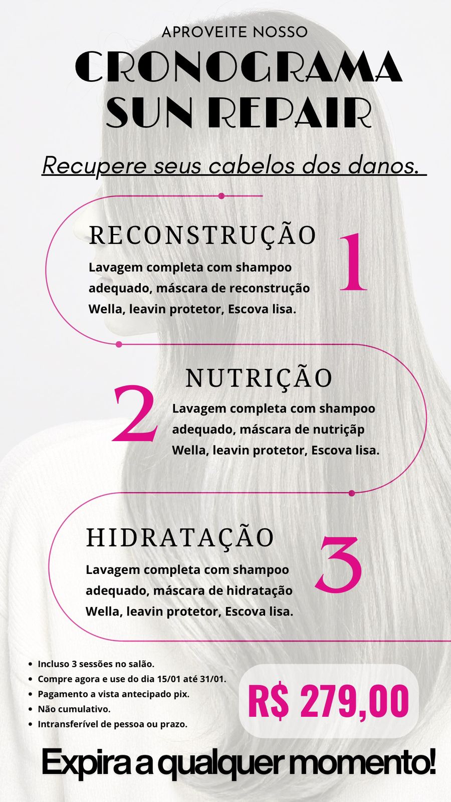 O cronograma Sun Repair está disponível pelo valor promocional de R$ 279,00, incluindo as três sessões no salão. A compra deve ser feita à vista, via Pix, e o uso é válido de 15/01 até 31/01.