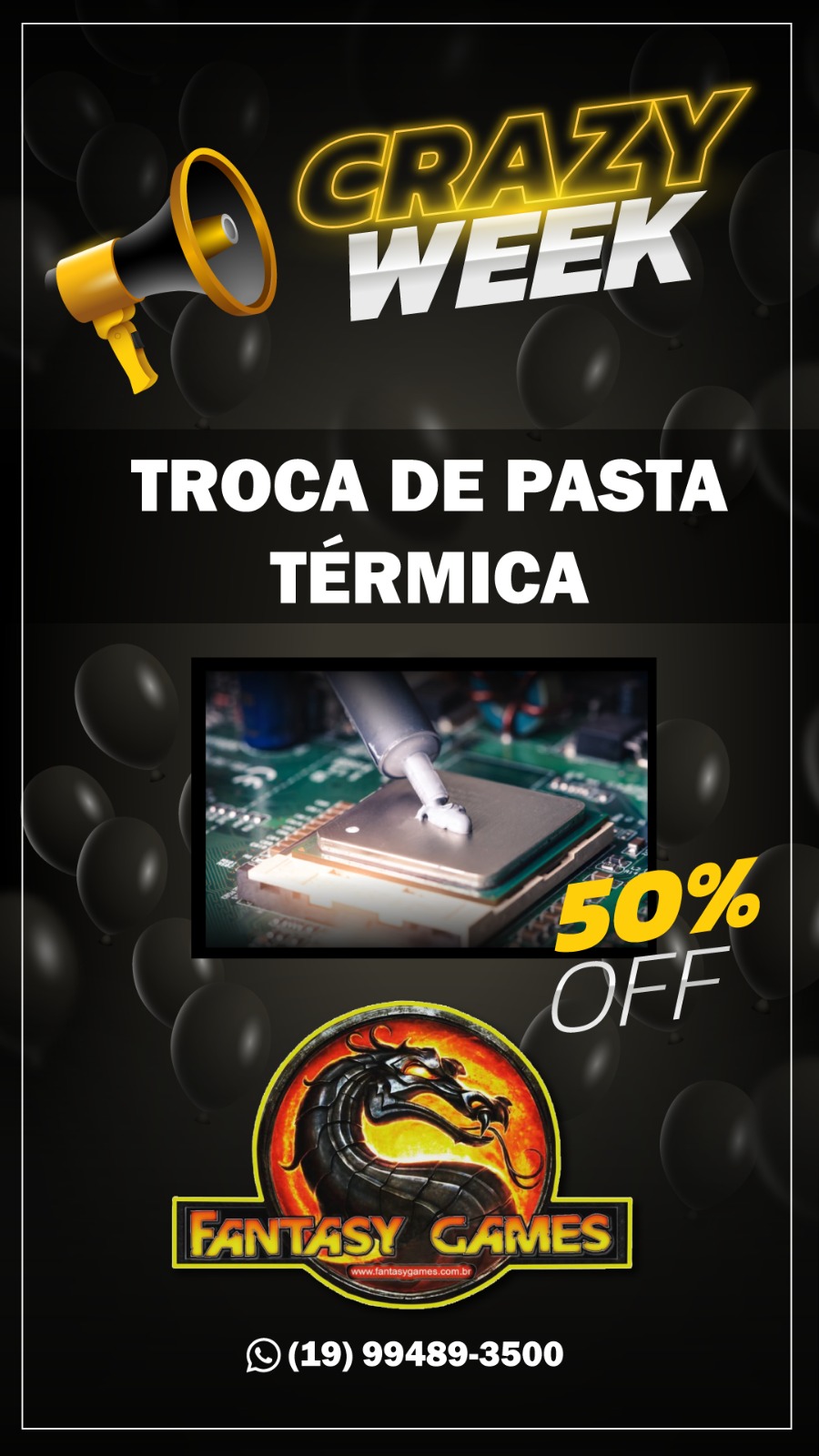 E tem mais: durante a Crazy Week, você ainda poderá aproveitar troca de pasta térmica e revisão completa do seu videogame com preço especial. É a oportunidade perfeita para deixar seu console tinindo e pronto para horas de diversão.