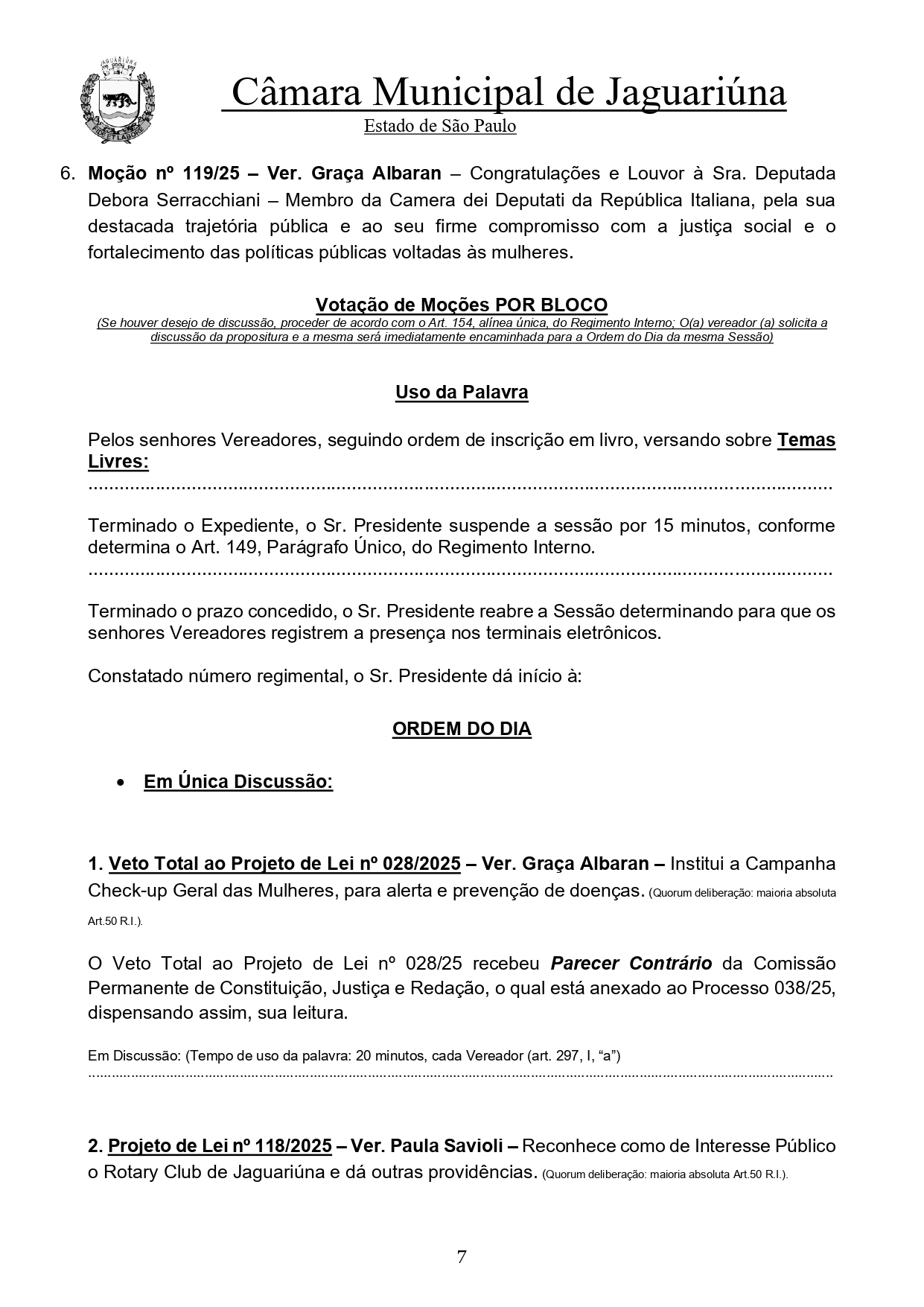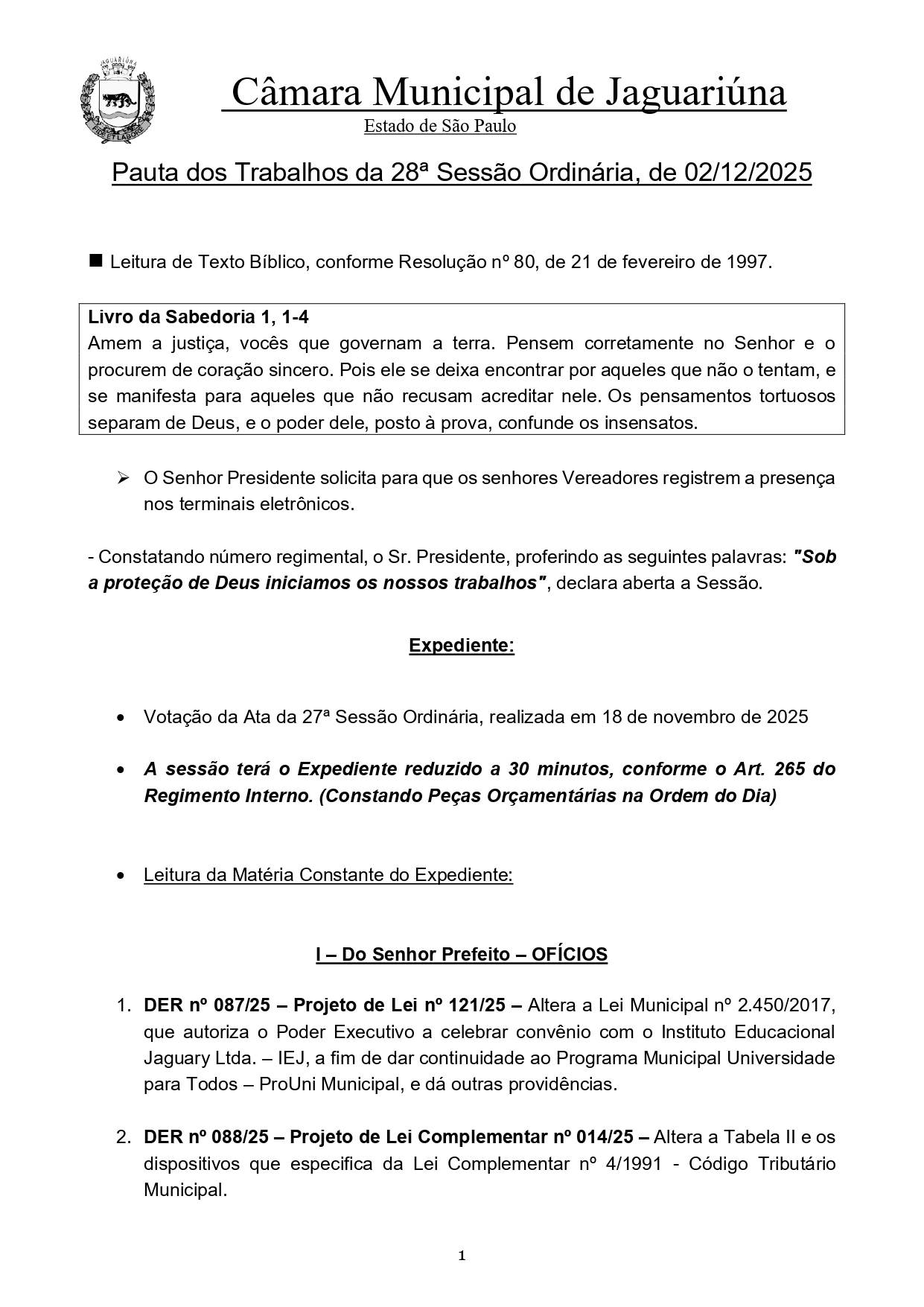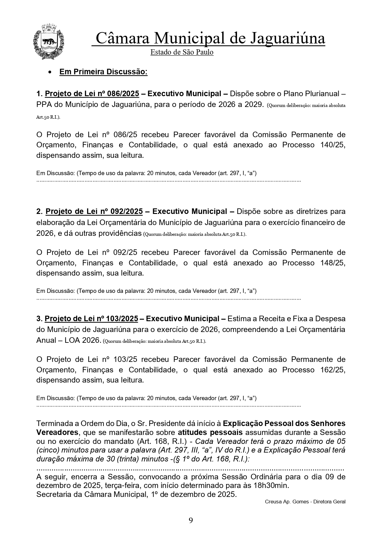 A 28ª Sessão Ordinária da Câmara Municipal de Jaguariúna, será realizada nesta terça-feira (2), vai ser marcada pela análise de projetos do Executivo e do Legislativo, além da discussão das principais peças orçamentárias que norteiam o planejamento financeiro do município para 2026.