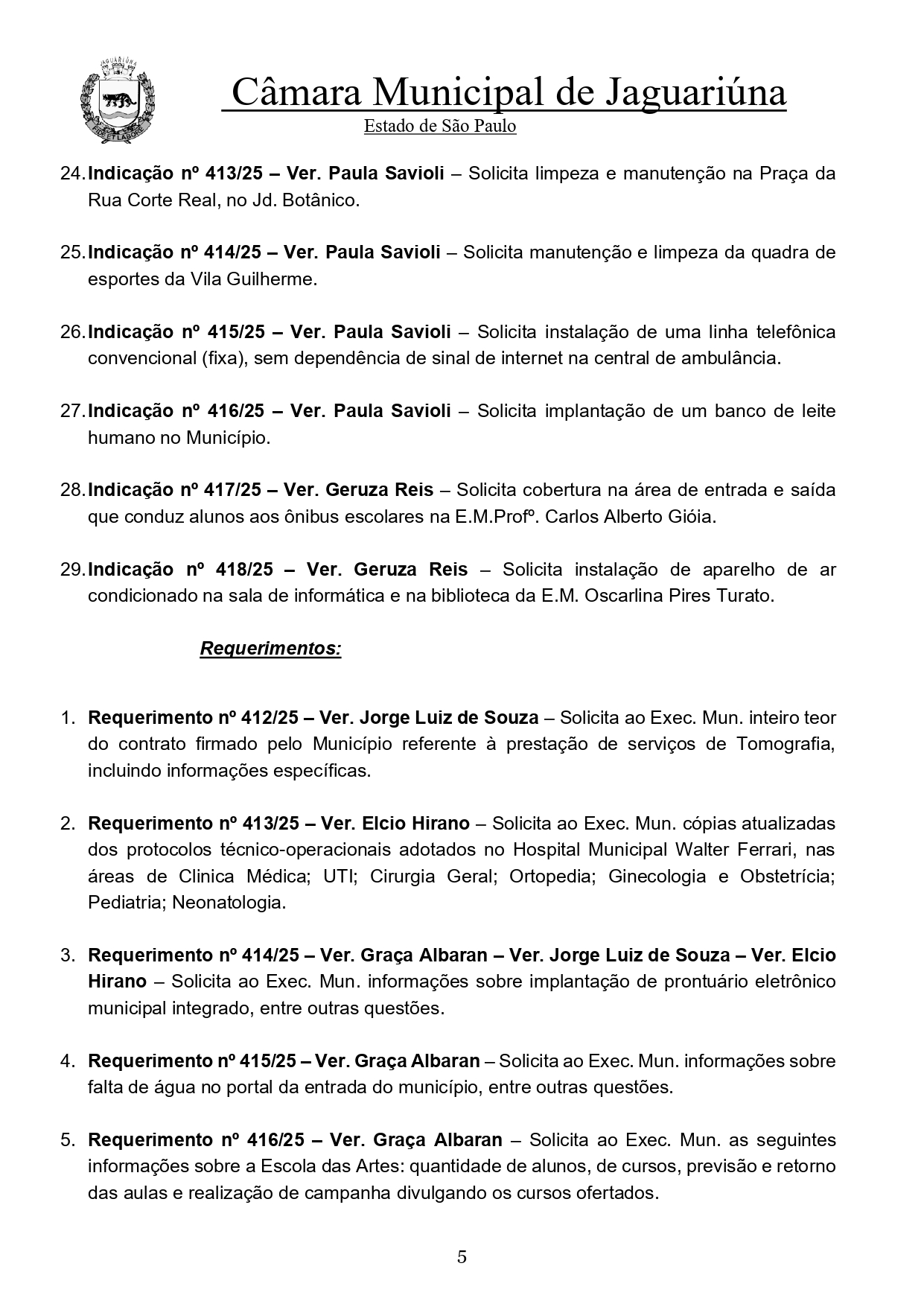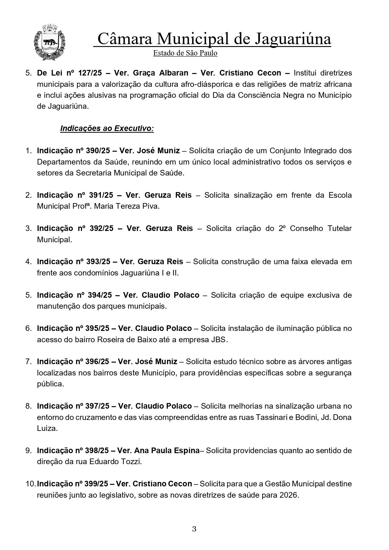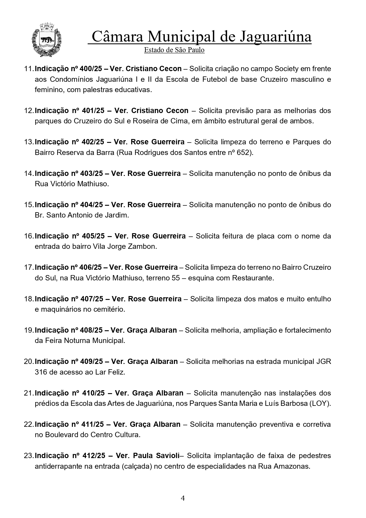Ao todo, 29 indicações foram encaminhadas ao Executivo, solicitando melhorias em sinalização, limpeza de terrenos, manutenção de parques, ampliação de serviços de saúde, estrutura escolar e ações culturais.