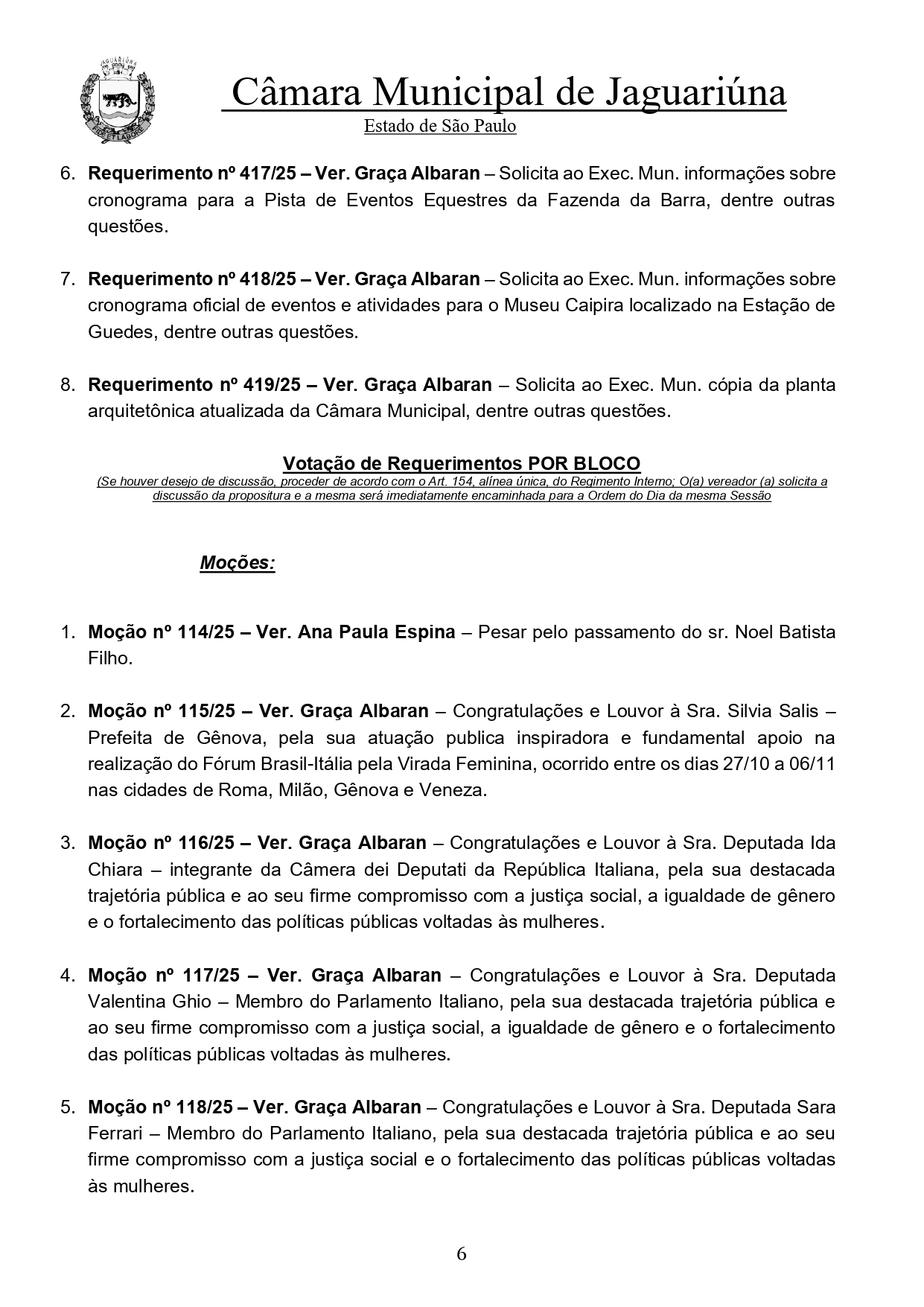 Sessão tem votação de moções e requerimentos em bloco, apresentação de novas propostas e debate das peças orçamentárias PPA, LDO e LOA