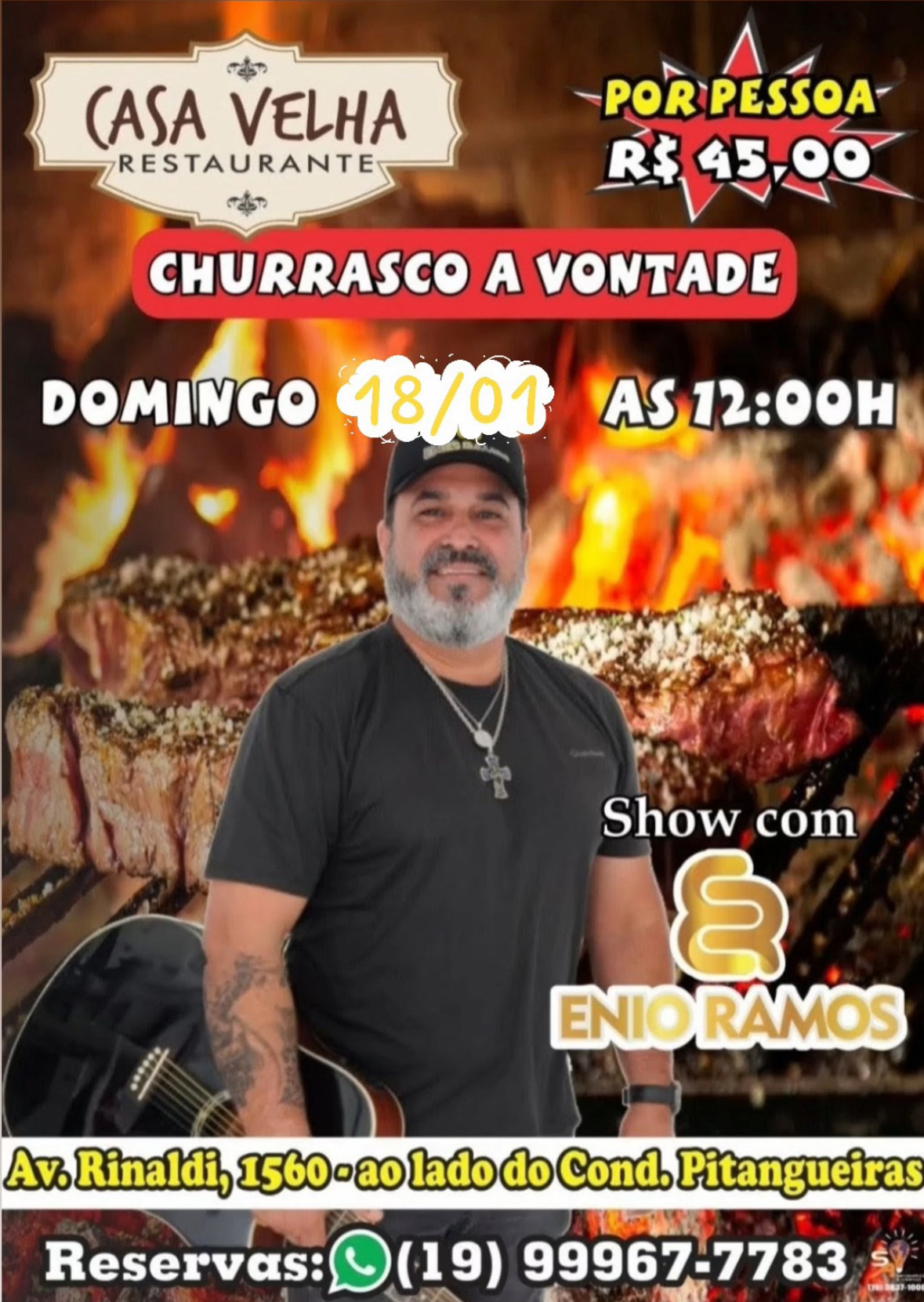 Para completar a experiência, o evento terá show ao vivo com Ênio Ramos, trazendo um repertório animado que combina perfeitamente com o clima de churrasco e confraternização.