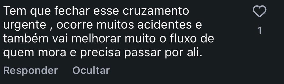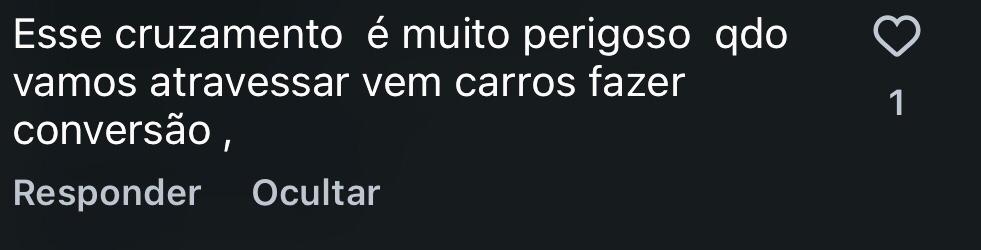 Também houve comentários apontando o risco durante as conversões, com relatos de que “quando vamos atravessar vem carros fazendo conversão”, reforçando a percepção de insegurança no cruzamento.