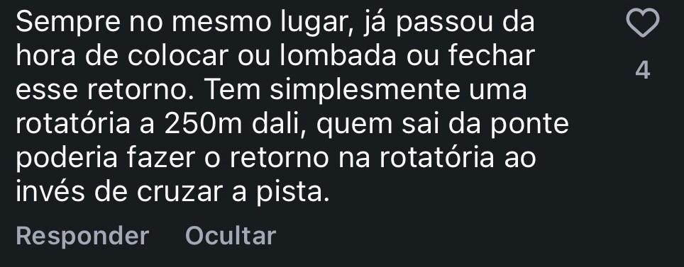 “sempre no mesmo lugar, já passou da hora de colocar lombada ou fechar esse retorno”, enquanto outro destacou a existência de uma rotatória a cerca de 250 metros e sugeriu seu uso como alternativa para evitar a travessia direta da via.