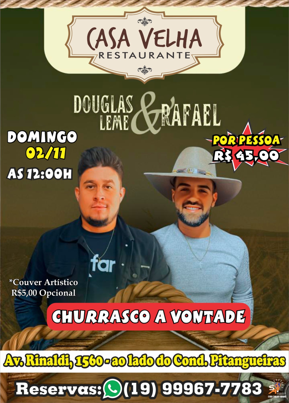E para deixar o clima ainda melhor, o domingo contará com show ao vivo da dupla sertaneja Douglas Leme & Rafael, trazendo o melhor do modão raiz e do sertanejo universitário. É música boa, comida de verdade e muita animação para celebrar o fim de semana em grande estilo!
