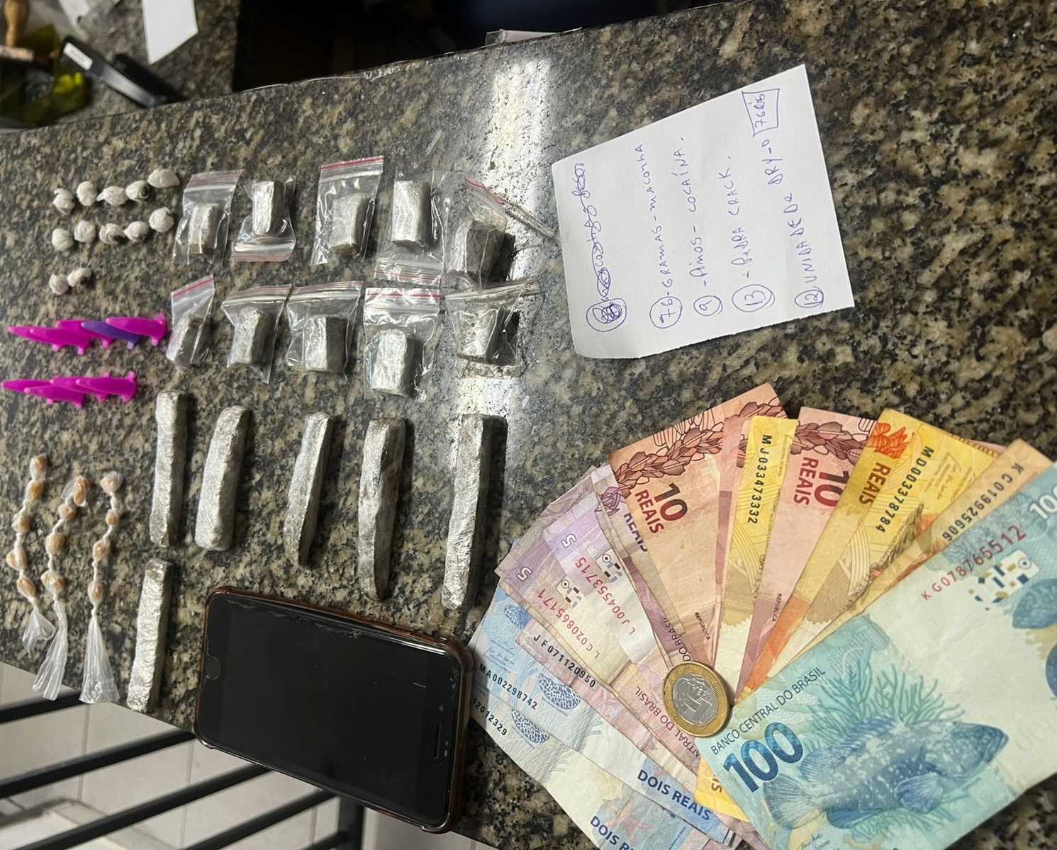 Durante a revista, os agentes encontraram com o suspeito um celular e R$ 370 em dinheiro. Em buscas nas proximidades, sobre o telhado de uma casa, também foram localizados mais R$ 330, além de porções de maconha, cocaína, “dry” e pedras de crack.
