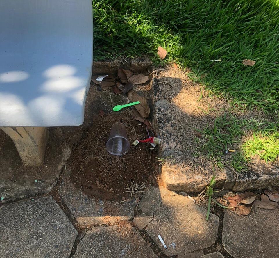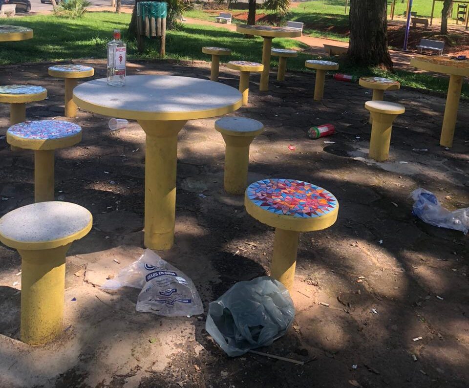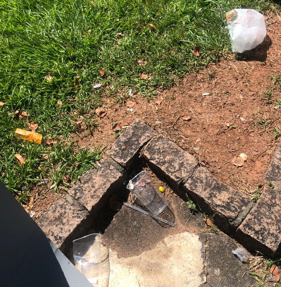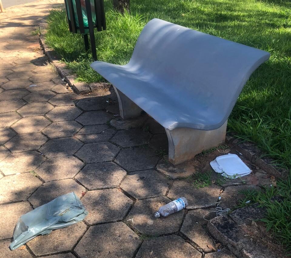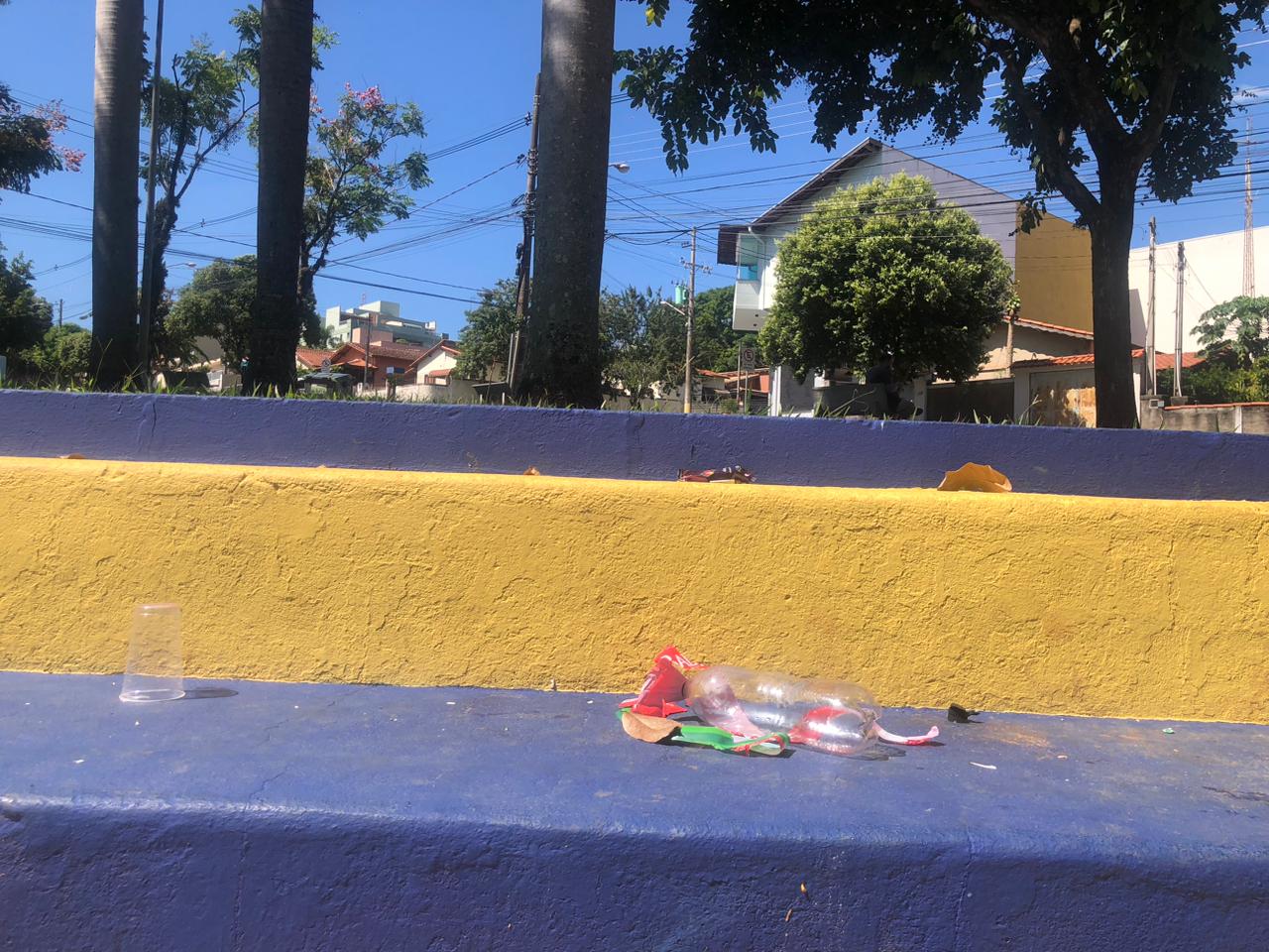 Mesmo passando por melhorias, a Praça Mogi Mirim é tomada por garrafas, copos e embalagens descartadas de forma irregular