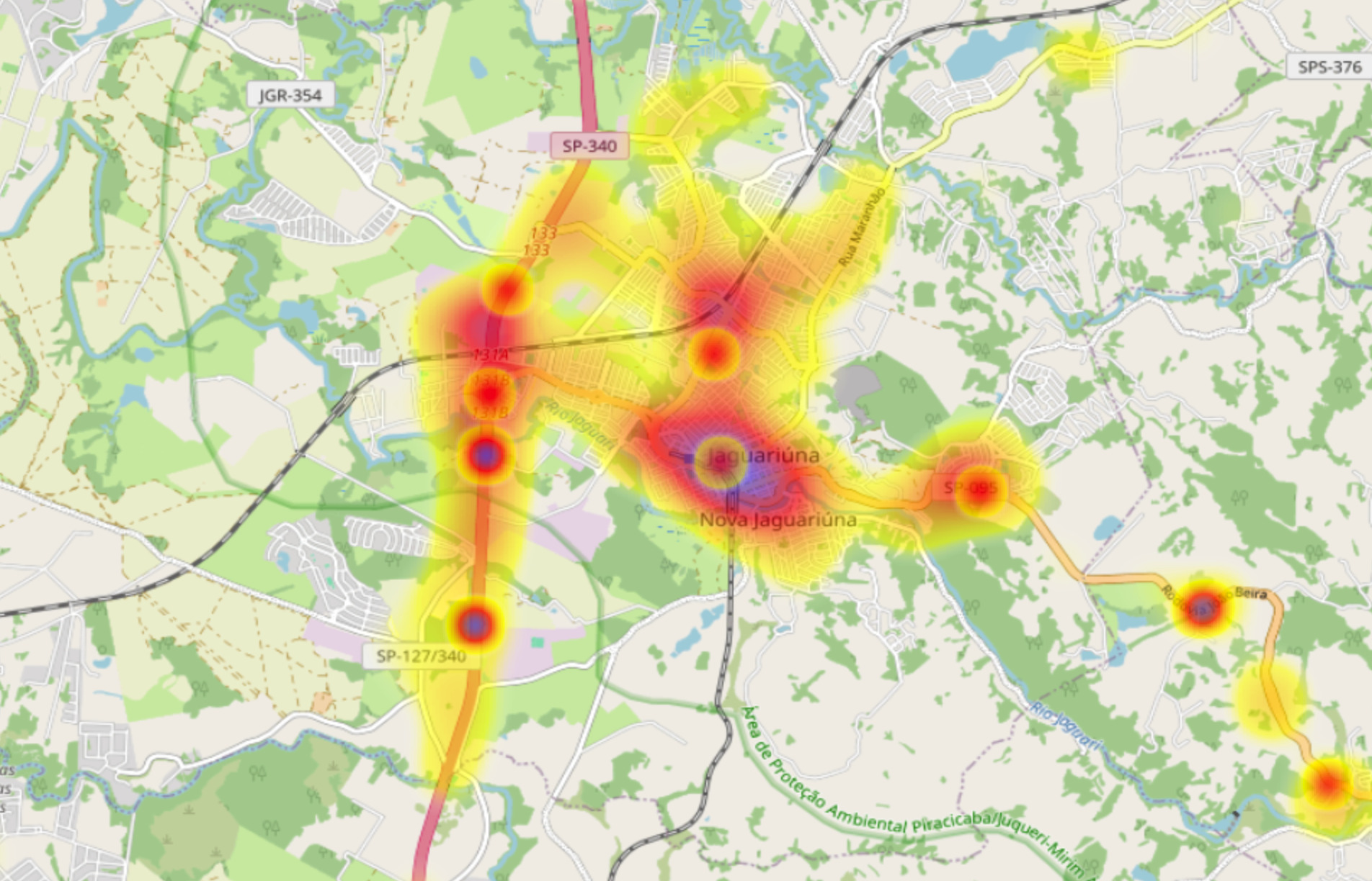 A Rodovia SP-340, que corta o território jaguariunense, segue como o principal ponto de concentração de acidentes e mortes no trânsito. Segundo mapas do Infosiga-SP, dentro do perímetro urbano, rotatórias e cruzamentos aparecem entre os locais com maior número de ocorrências. As áreas com maior intensidade de tráfego figuram no topo da lista de trechos críticos.