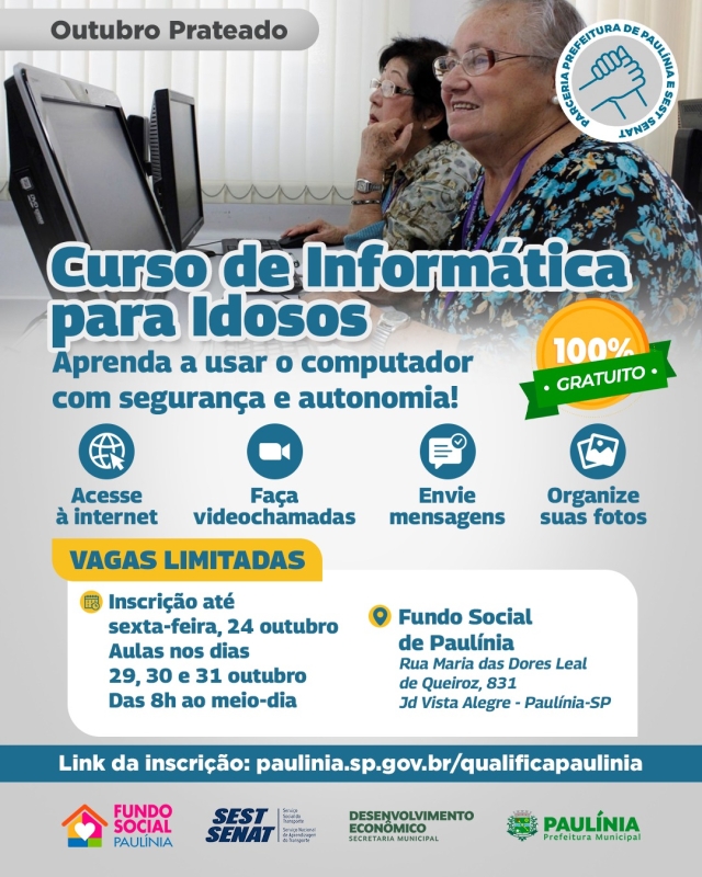 A Prefeitura de Paulínia, por meio da Secretaria de Desenvolvimento Econômico, em parceria com o Fundo Social de Solidariedade e o Sest/Senat, está com inscrições abertas para o Curso de Informática para Idosos. A iniciativa é totalmente gratuita e tem como objetivo estimular a inclusão digital, proporcionando mais autonomia, segurança e confiança no uso das ferramentas tecnológicas.