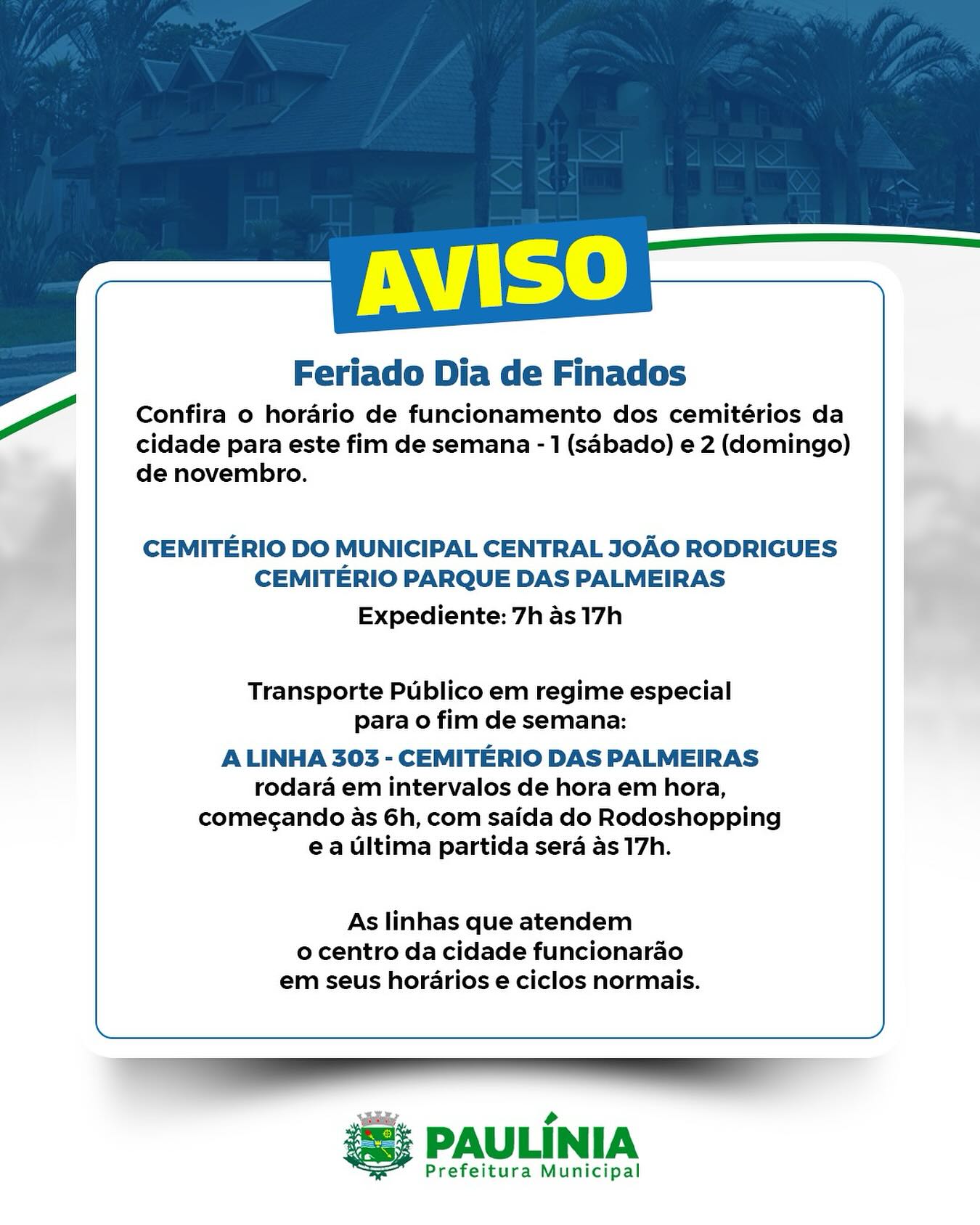 A Prefeitura de Paulínia divulgou os horários de funcionamento dos cemitérios municipais e o esquema especial de transporte público para o feriado de Finados, celebrado neste fim de semana, nos dias 1º (sábado) e 2 (domingo) de novembro.