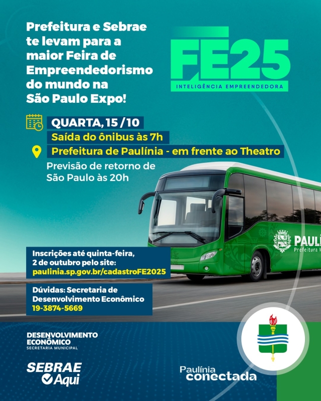 A Prefeitura de Paulínia, em parceria com o Sebrae, convida os empreendedores da cidade para participar da Feira do Empreendedorismo 2025, considerada a maior do setor no mundo, realizada em São Paulo, no espaço São Paulo Expo, entre os dias 15 e 18 de outubro.