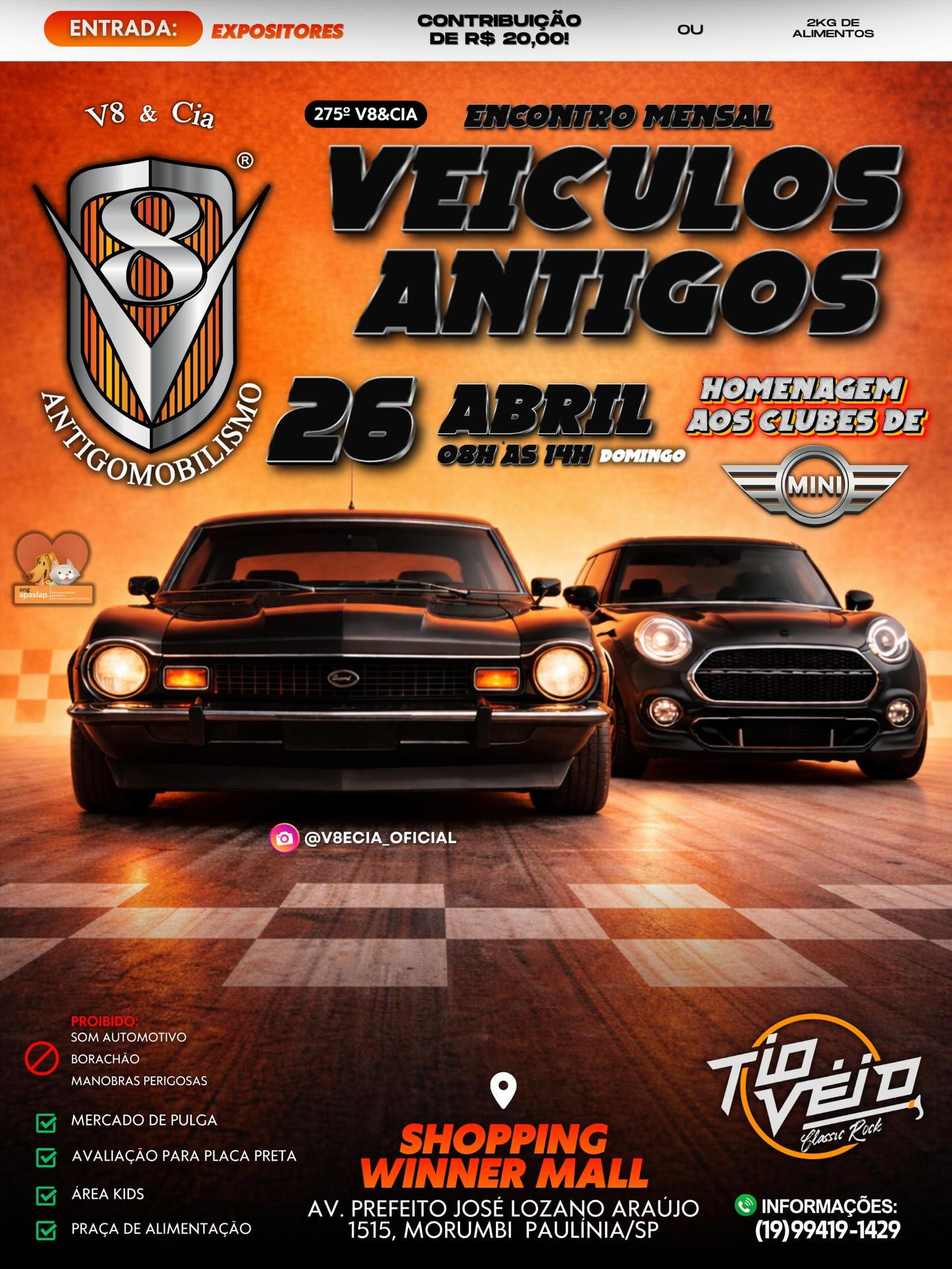 Neste domingo, 26 de abril de 2026, das 8h às 14h, Paulínia recebe mais uma edição do Encontro Mensal de Veículos Antigos, promovido pelo grupo V8 & Cia Antigomobilismo, no Shopping Winner Mall. O evento promete reunir apaixonados por carros clássicos, expositores e famílias em um encontro que celebra modelos históricos que marcaram época no automobilismo.