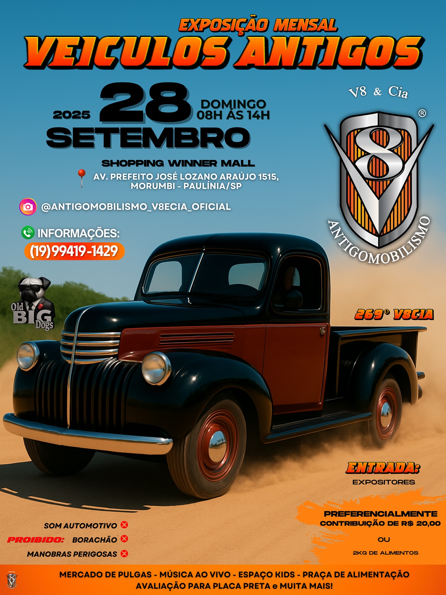 No dia 28 de setembro (domingo), das 8h às 14h, Paulínia vai receber mais uma edição da Exposição Mensal de Veículos Antigos, realizada no Shopping Winner Mall. O evento é uma ótima oportunidade para toda a família e apaixonados por antigomobilismo.