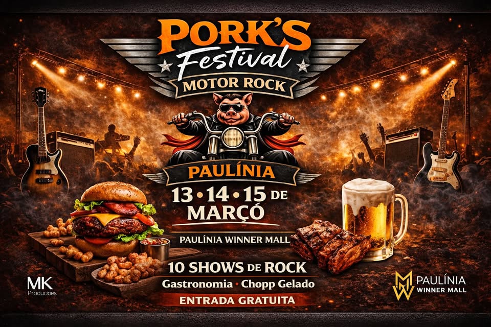A cidade de Paulínia recebe pela primeira vez o Pork’s Festival Motor Rock, evento que reúne música ao vivo, gastronomia e entretenimento para toda a família. O festival acontece entre os dias 13 e 15 de março, no Winner Mall, com entrada gratuita.