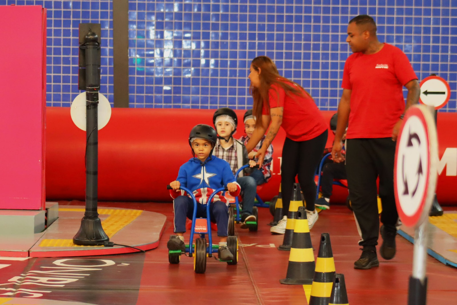 As atividades ocorrem em uma estrutura de 600 m² que simula o ambiente urbano, com vias, faixas de pedestre e placas de sinalização. As crianças assistem a uma peça teatral educativa e depois percorrem o circuito com bicicletas e triciclos, vivenciando situações do cotidiano no trânsito.