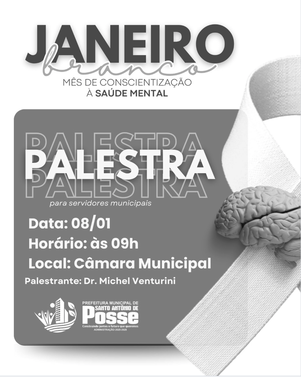 Dentro da programação do Janeiro Branco, mês dedicado à conscientização da saúde mental, Santo Antônio de Posse recebe uma palestra especial voltada aos servidores municipais nesta quarta-feira, dia 8 de janeiro, às 9h, na Câmara Municipal.