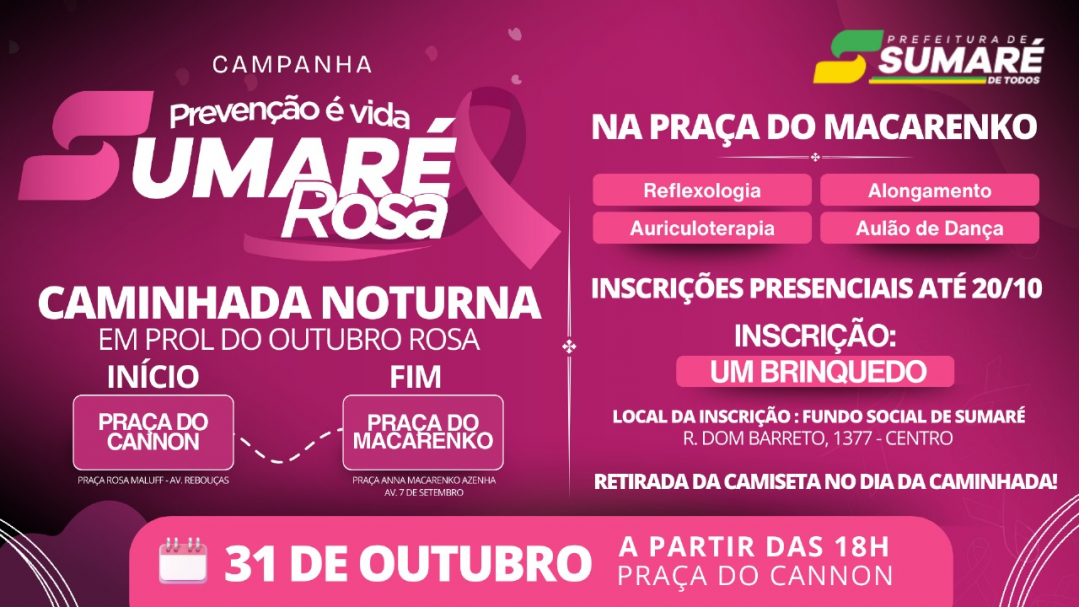 A Prefeitura de Sumaré, em parceria com o Fundo Social de Solidariedade e as Secretarias Municipais, convida toda a população para participar da Caminhada Noturna do Outubro Rosa, que acontecerá no dia 31 de outubro. A iniciativa alia a conscientização sobre a prevenção do câncer de mama a uma importante causa social: a arrecadação de brinquedos para crianças do município.